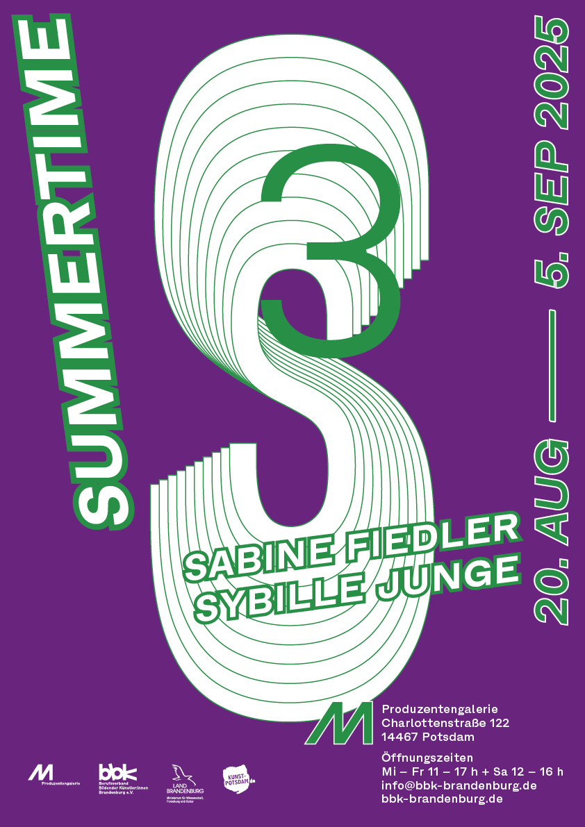 "S 3 – Summertime I Sabine Fiedler/ I Sybille Junge" I 20.8. - 5.9.25 I Eröffnung: 19.8.25 - 18 Uhr I Öffnungszeiten: Mi – Fr 11 – 17 Uhr , Sa 12 –16 Uhr I Träger der Produzentengalerie M ist der Berufsverband Bildender Künstler:innen Brandenburg e.V. I Charlottenstr. 122, 14467 Potsdam ►Flyer I www.bbk-brandenburg.de I www.bbk-brandenburg.de/produzentengalerie-m/